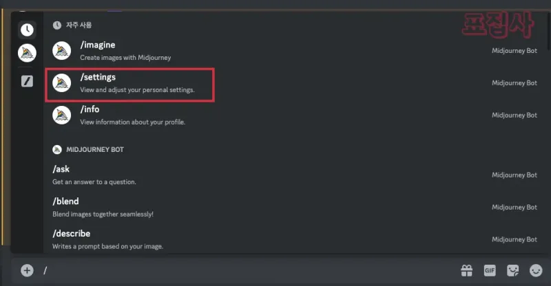 디스코드 봇 채팅창에서 /settings 명령어를 입력합니다.