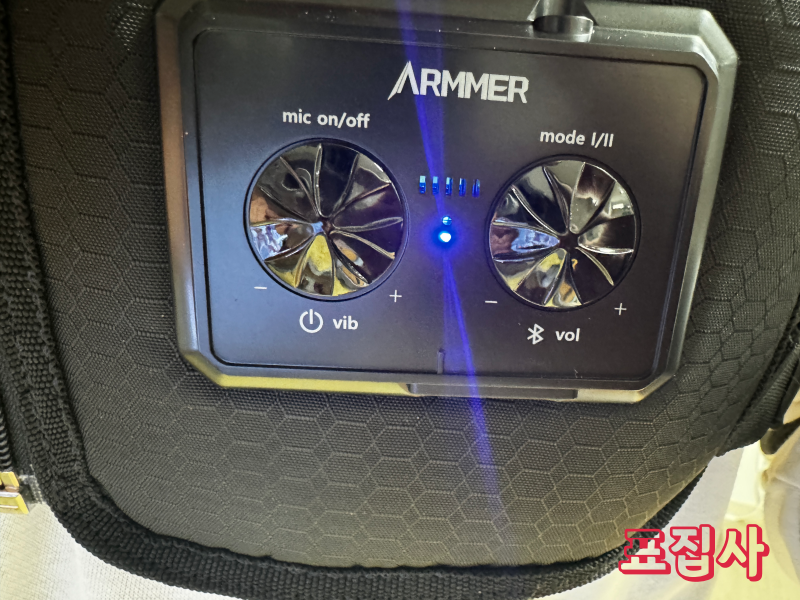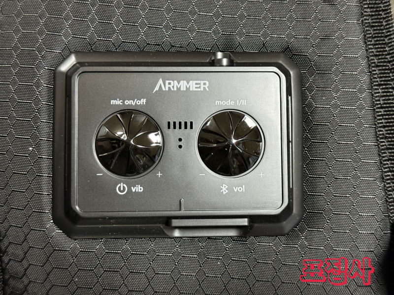 햅틱아머의 무게는 약 1kg으로 오랜시간 착용해도 그렇게 부담 없는 무게입니다. 실제로 착용하고 게임하는데 그렇게 부담스러운 무게는 아니었습니다. 스피커, 배터리, 햅틱 장치가 들어가 있는 거 치고는 가볍다고 느껴집니다. 전면 왼쪽 가슴에 조작용 콘솔이 있어서 오른손잡이인 제가 사용하기 편했습니다. 가슴부위는 스피커 햅틱은 없고 배터리와 조작 콘솔만 있는 거 같습니다.
