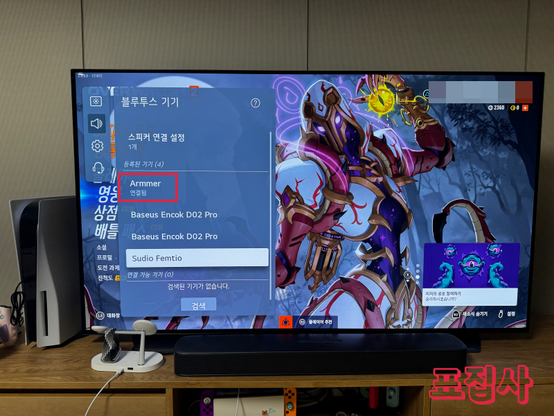 플스 5는 연결이 안 될 거 같아서 텔레비전에 연결해서 사용했는데 반응이 나쁘지 않고 사용하는데 문제없이 잘 사용되었습니다. 블루투스 연결은 다른 블루투스 장비와 동일한 방법으로 연결 가능합니다. 전원을 켜면 LED가 깜빡깜빡하며 텔레비전에 "ARMMER"가 새로운 장치로 뜨는데 연결해 주면 되겠습니다.