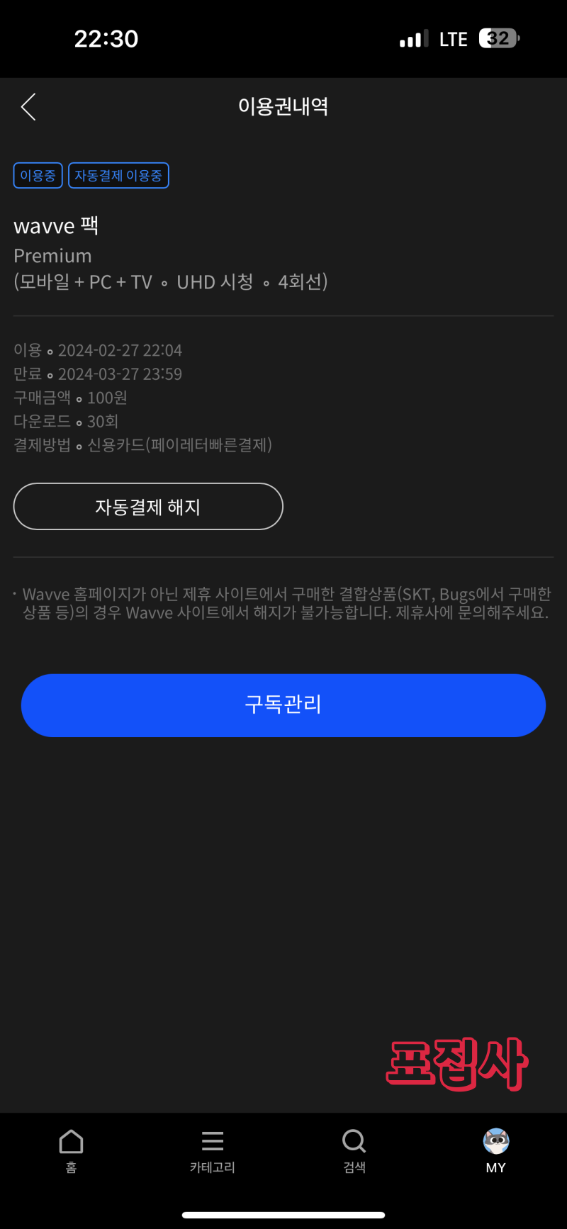 메뉴 MY → 이용권 → 자동결제 해지