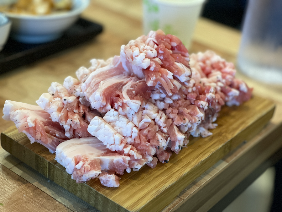 흔히 말하는 벌집 삼겹살과 비슷하게 삼겹살에 칼집이 있는데 눈꽃 삼겹살은 칼집을 벌집 삼겹살보다 더 촘촘하고 많이 해서 눈꽃처럼 보이는 삼겹살입니다.