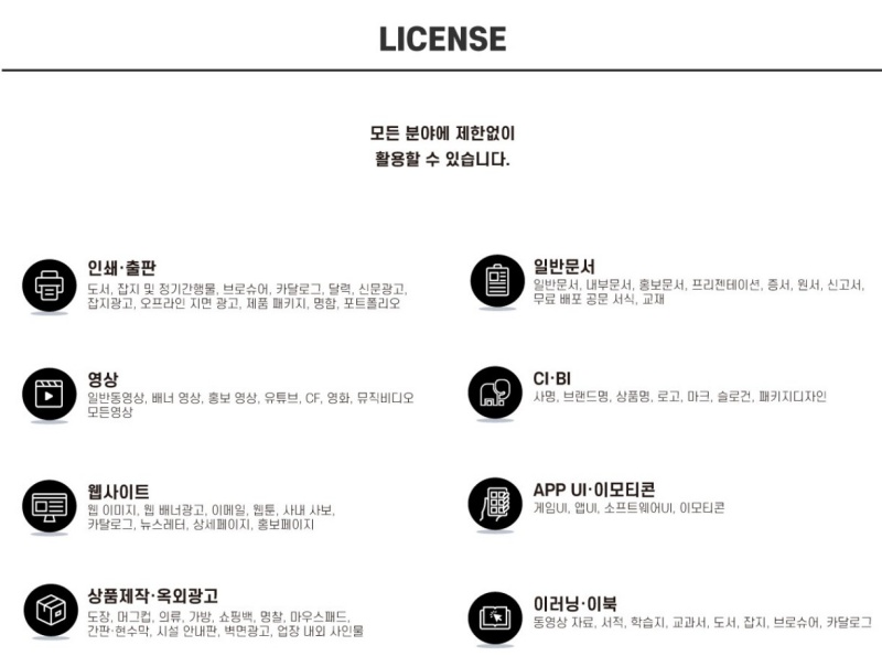 영상 : 방송 및 영상물 자막, TV-CF, 온라인 영상 광고, 영화 오프닝/엔딩 크레디트 자막, UCC 등 - 사용가능
