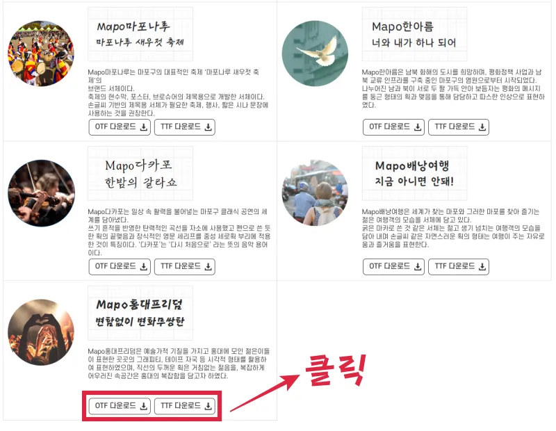 2. Mapo홍대프리덤 폰트 다운로드 클릭하여 다운로드